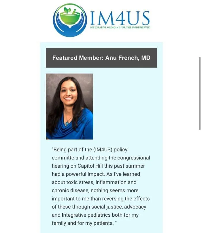 More athttps://im4us.org/…/featured-memb…/anu-french-md-faap-aboim/Integrative Medicine for the Underserved (IM4US) is a collaborative, #multidisciplinary group of people committed to #affordable#accessibleintegrative health care for all. Through #outreach#education#research, and #advocacy, we support those dedicated to promoting health in underserved populations.